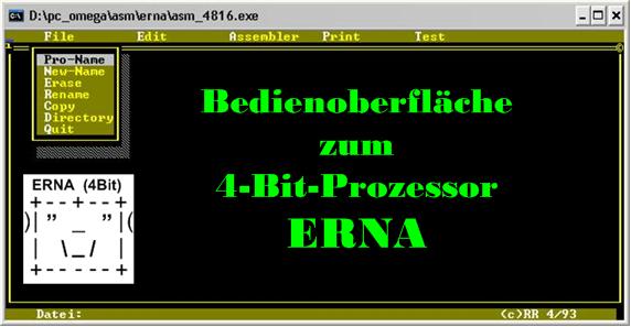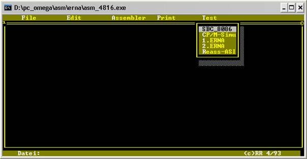 Auch hier gibt es Arbeitsvarianten für andere Prozessoren. Die anderen funktionieren nur wenn die entsprechende Software bereit steht. Neben den beiden Simulatoren „1.ERNA und 2.ERNA“ gibt es hier auch einen „Re- bzw. Dis-Assembler, der aus einem Maschinenprogramm versucht wieder eine Quelle zu erzeugen. Dazu mehr unter „Disassembler“.