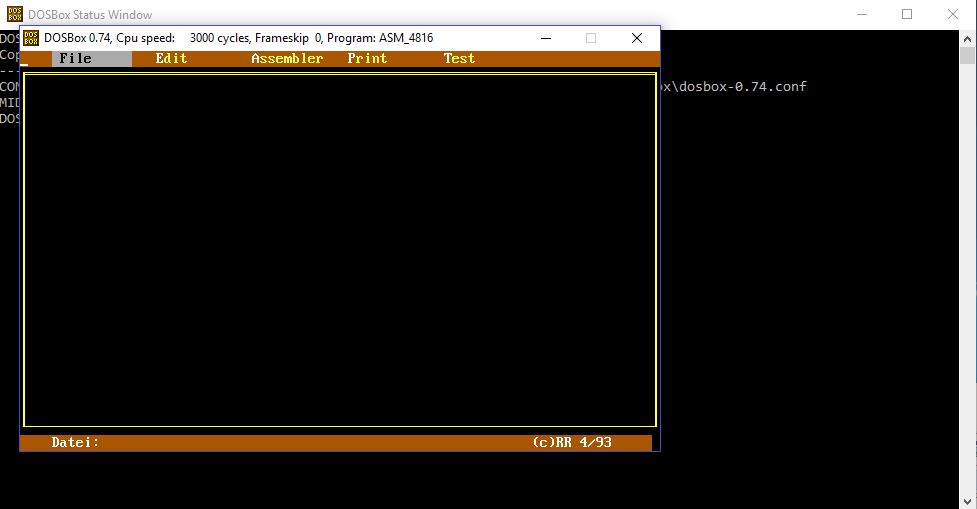 Das Erscheinungsbild ist das bekannte schwarze DOS-Fenster. Das System simuliert sowohl den Prozessor 80x86 wie auch