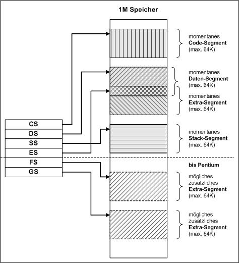 Wie erhält man nun ein 20Bit Adresse? 2 Byte reichen nicht, nimmt man 3 Byte kann man 24Bit zur Adresse benutzen, verschenkt aber, da nur 20 möglich sind, 4 Bit. INTEL ging einen anderen Weg. Man definiert Segmente, in diesen wird mit 16 Bit adressiert (also 64K), das Segmant kann aber relativ frei beliebig in den Speicher eingeordnet werden. Das geschieht indem man dem Segment eine "Basisadresse" gibt und die ist 20Bit groß. Die Festlegung dieser Basisadresse ist ganz einfach, der im Segmentspeicher stehende Wert (Adresse) wird einfach 4 mal nach links geschoben, also mit 16 multipliziert. Damit kann also die maxile Adresse 64K * 16 = 1024K = 1M sein. Damit ist noch nicht viel erreicht, denn wir bewegen uns ab Basisadresse maximal in einem 64K Adressraum. INTEL musste also weitere Segmentadressen spendieren, um den weiteren Speicherbereich nutzen zu können. So entstanden also die 4 Segmentregister: CS, DS, SS und ES. Die Aussagen gelten für ein Programm. Durch weitere Programme, wie z.B. spezielle Unterprogramme, die ja auch über die 4 Segmentadressen verfügen können, kriegt man den Speicher dann voll. Mit 16 Segmenten wäre der Speicher komplett ausgelastet. Aber es gibt auch die Möglichkeit Segmente überlappend zu betreiben, grob gesehen, sind das die Anfänge von "Shared Memory". Natürlich muss man aber auch wissen, dass der Assembler diese Problematik verwalten muss, es muss entsprechende Organisationsbefehle geben! Und der Assemblerprogrammierer muss festlegen, wo die Segmente liegen sollen. Die Beschreibung nennt neue Begriffe, die zu entsprechender Zeit noch geklärt werden müssen, wie z.B. Stack-Segment. Damit muss man wissen was ein Stack ist und wie er in diesem System funktioniert. Man kann aber sofort schon feststellen, dass das Programm wohl im Codesegment und die Daten zum Programm im Datensegment gespeichert werden, das entspricht der Harvard-Architektur von Rechnern. Wir werden aber noch sehen, dass wir diese Struktur auch wieder ändern können. |