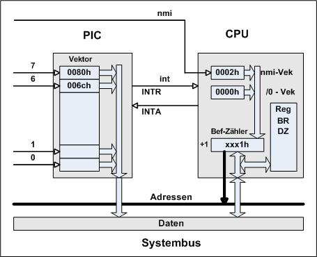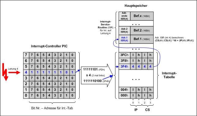 feststellen, dass es einen Interrupt gibt, von wem muss man ermitteln. Interrupte werden ausgelöst, wenn es Probleme gibt - man sollte so schnell wie möglich darauf reagieren. Um schnell zu sein, wurde ein spezieller Interrupt-Baustein entwickelt, der PIC (programmierbarer Interrupt-Controller). Der PIC hat acht 1Bit Eingänge. Nach den Eingängen folgt jeweils ein programmierbares Adressenregister, man nennt die Adresse Interrupt-Vektor. Die Eingänge haben Prioritäten, 0 höchste Priorität. Wird an einem Eingang ein Ereignis angezeigt (Bit = 1), steht zum Bus eine Adresse bereit und der PIC meldet dem 8086 über Leitung "int" das INTR Signal (Interrupt-Request (1Bit)). Kann der 8086 einen Interrupt annehmen, meldet er INTA zurück (Interrupt-Acknowledge). Nun legt der PIC die Adresse auf den Bus, aus der die Adresse für die Interrupt-Behandlungsroutine ermittelt wird (Interrupt-Service-Routine bzw. ISR). Die Ermittlung der ISR-Adresse erfolgt über die Interrupt-Vektor-Tabelle aus dem Hauptspeicher. Jede Adresse belegt 4 Byte: 2 Byte CS und 2 Byte IP, also die erste Adresse ist 0, die zweite 4. Auch intern greift der 8086 auf diese Tabelle zu, in der stehen auf der entsprechenden Speicherplatz-Nr. die realen Adressen der ISR und je kleiner die Nr. um so höher die Priorität. Sollte z.B. die ALU eine Division durch 0 ausführen, wird intern auch ein Interrupt mit der ISR von Speicherplatz 0 ausgeführt, die Division durch Null hat also im System die höchste Priorität!