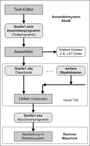 so ganz, denn die Änderung geht auch schon im Assembler los. Der Assembler erzeugt kein lauffähiges Maschinenprogramm, sondern ein verschiebbares Maschinenprogramm, das heißt nun Objektprogramm. Das bedeutet, es gibt noch z.B. symbolische Sprungadressen, keine festen. Damit kann das Programm an beliebiger Stelle in den Arbeitsspeicher geladen werden. Das ist gut, denn nun können auch andere Programme hinzugefügt werden. Die Verbindung unseres so übersetzten "Quelle1.obj-Objektprogramms" mit anderen schon vorhandenen Objektprogrammen übernimmt der neue Teil, der Linker (oder auch Binder). Der Linker erzeugt ein festes Maschinenprogramm. Auch wenn keine anderen Programme mit einbezogen werden sollen, muss immer der Linker arbeiten, da der Assembler generell nun verschiebbare Programme erstellt.