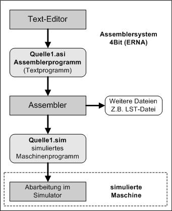 sagt auch assembliert). Im letzten Schritt kann nun das erarbeitete Maschinenprogramm auf der Rechenmaschine gestartet werden. Bei "ERNA" ist die Maschine der Simulator. |