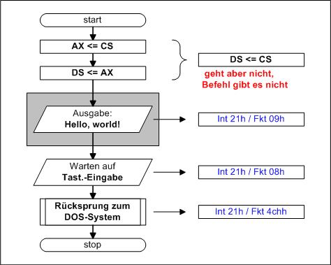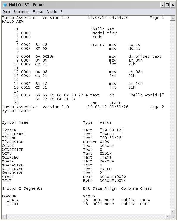 man auch sofort, dass die Segmentdirektiven, das sind Assemblerbefehle, nicht codiert