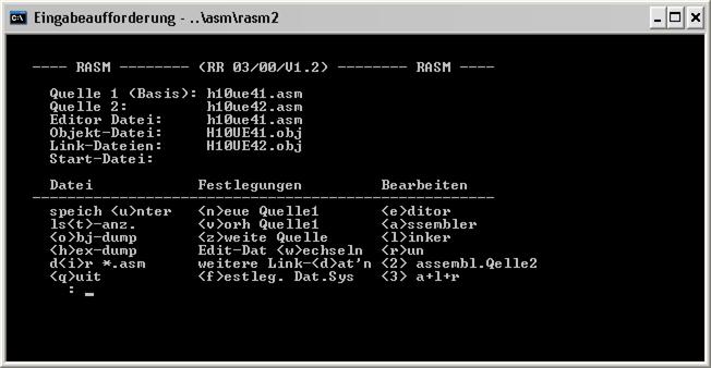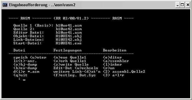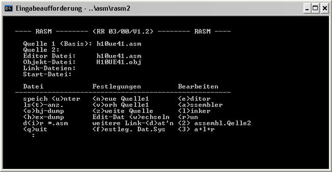 Im nächsten Schritt wird nun mit <z> die zweite Quelle "H10UE42.asm" festgelegt und mit <2> übersetzt. Es entsteht als Link-Datei die Objektdatei "H10UE42.obj" |