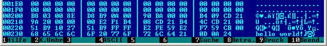 Links ist der Hex-Dump vom erzeugten Maschinen-Programm zu sehen. Das Programm (h10ue41) wird von Adresse 00200h bis 0021Hh in den Speicher geladen, das UP (h10ue42) von 00220h bis 0022Eh und die Daten (Text) von 00230h bis 0023Eh. Es funktioniert genau wie das Programm im Beispiel 3! |