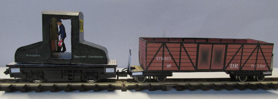 | Die Lok in Aktion - sie bewegt einen neuen, ebenfalls mit den beschriebenen Drehgestellen ausgestatteten, offenen Güterwagen. |