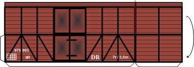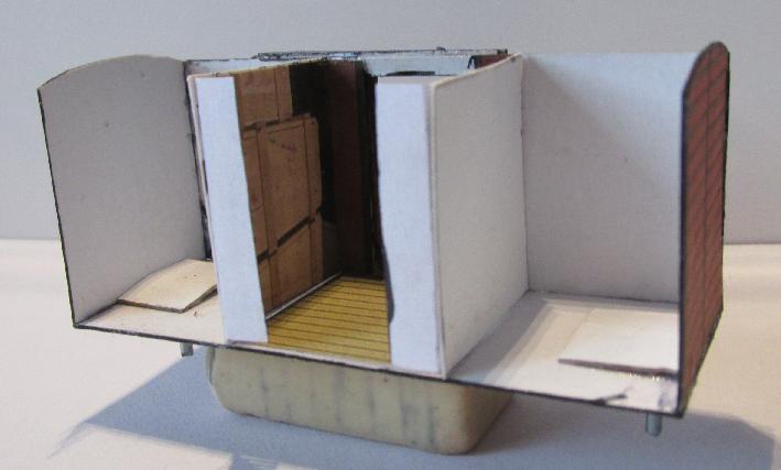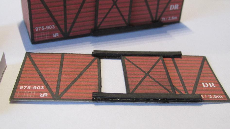 auch in den Wagen sehen - es muss da etwas gestaltet werden! Die Türen müssen auch von der Rückseite gestaltet werden, denn es kann ja auch eine Tür zu sein. Und die Seitenwände neben der Tür sind auch zu sehen. Das kann man gut mit den Zwischenwänden lösen, diese stellen Bilder von Ladegut dar und zugleich auch ein Stück Seitenwand. Und einen Boden braucht man nun auch! |