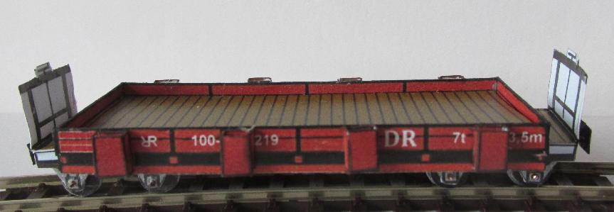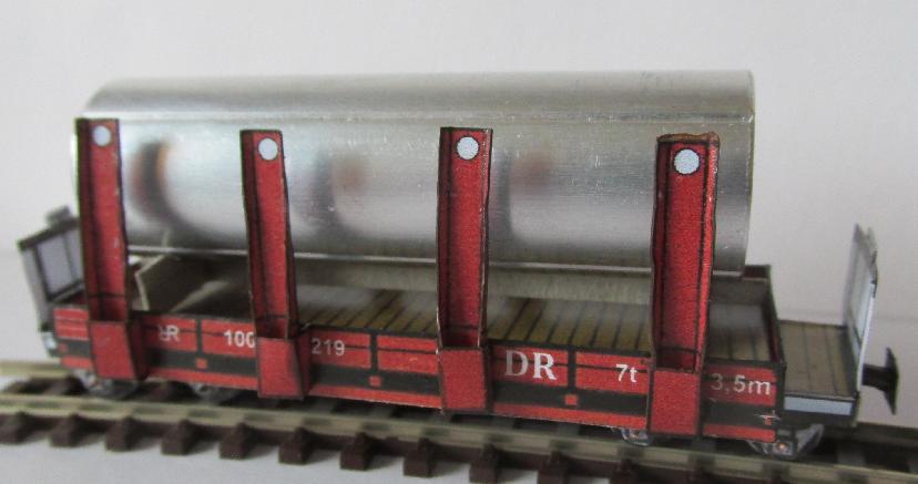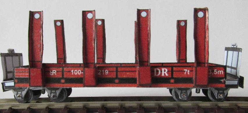 Mit den aufgesetzten Rungen kann man nun sperrige Güter transportieren oder man entfernt die Rungen, dann hat man einen normalen Güterwagen mit sehr niedriger Bordwand, nahezu einen Plattenwagen. |