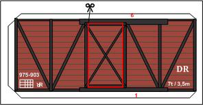 In dieser Art sollen geschlossene Güterwagen erstellt werden. Die Seitenwände, Stirnseiten und Bodenplatte werden durch Pappe verstärkt, innen werden zur Stabilisierung zwei Zwischenwände eigezogen, man erhält einen sehr stabilen und anfaßbaren Wagen. Der Ausschneidebogen läßt verschiedene Ausbauvarianten zu, so kann man z.B. die Tür ausscheiden und und außen auf die Seitenwand neben der Türöffnung wieder aufkleben. In der höchsten Ausbaustufe kann die Tür verschiebbar angebracht werden. |