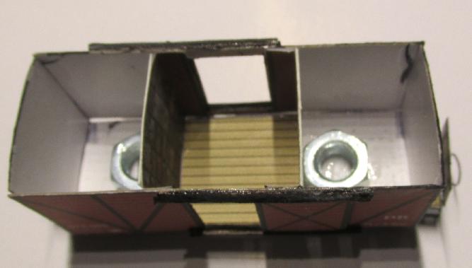 Die Zwischenwände sind eingeklebt. Links und rechts gibt es somit später nicht sichtbare Bereiche - das ist gut, denn hier müssen die Zapfen (Nägel) zum Anbringen der Drehgestelle eingefügt werden. So wie im Bild gezeigt, sollte man die Nägel mit Pappe überkleben, denn es hat sich gezeigt, dass versehentlich doch einmal ein Nagel nach innen gedrückt wurde und weg war - was nun? Die Pappe verhindert das sehr gut. |