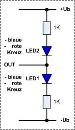 Funktion: Die Blinkschaltung ist eine digitale Schaltung, das bedeutet, am Ausgang OUT hat das Signal die Werte 0 oder 1 (0 entspricht Masse, 1 entspricht +Betriebsspannung). Liegt an OUT eine 1, so liegt zwischen OUT und -Ub etwa die gesamte Betriebsspannung - die LED1 leuchtet. Nach +Ub hingegen ist die Spannungsdifferenz etwa 0 - die LED2 leuchtet nicht. Liegt an OUT eine 0, so drehen sich die eben beschriebenen Verhätnisse um, es leuchtet jetzt die LED2 (LED1 nicht). Diese Art der Beschaltung kann man natürlich für alle Fahrzeuge, die mit zwei Blinklichtern (Rundumleuchten) ausgestattet sind, übernehmen. |