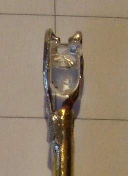 berühren (etwa 2mm Abstand). Die Lötstelle wird befeilt bis es ordentlich aussieht. Nun wird durch das Rohr von oben ein isolierter Draht gezogen (geschoben). Der Draht sollte am Ende schon abisoliert und verzinnt sein. Hat der Draht die richtige Position erreicht, wird er mit dem (plus)-Bein (Anode) der LED verlötet. !Er darf keine Verbindung zum Mast haben! Das Bild zeigt den Bearbeitungsstand. |