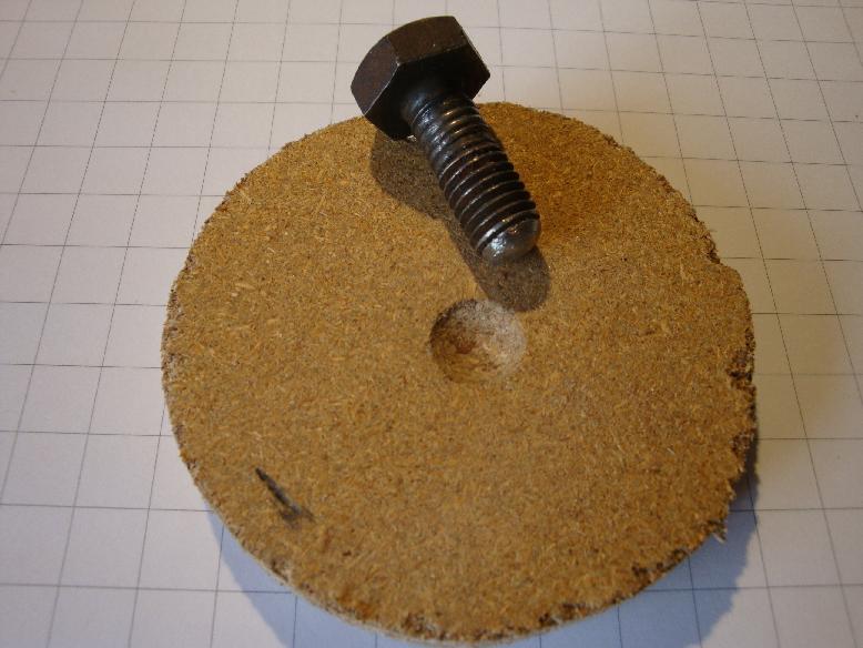Was noch fehlt ist der Lampenschirm. Dazu wird aus einem Messingblech ein rundes Stück von etwa 1,2cm Durchmesser angefertigt und in die Mitte ein Loch von 3mm gebohrt. Um nun die gewölbte Form zu erzeugen, wurde mit einem Kugelschleifer in einem Stück Holz eine Delle geschliffen. Weiter erhielt ein 8mm Bolzen unten eine schöne Rundung, damit wird nun die Scheibe in die Delle eingepasst (mit Hammer einschlagen!). Versuche zeigen, dass das auch mit normalen Unterlegscheiben geht. Ist das Loch zu groß, kann man zusätzlich eine kleinere Scheibe mit einlegen (bei der weiteren Bearbeitung - siehe oben). Der Lampenschirm wird ganz einfach mit Sekundenkleber auf die LED geklebt. |