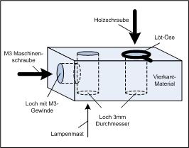 Durch ein Stück Vierkantmaterial werden zwei Löcher mit 3mm Durchmesser gebohrt. Durch das eine wird von oben die Lampe gesteckt und von der Seite mit einer M3-Schraube festgeschraubt. Durch das zweite Loch wird eine Holzschraube in die Modul-Oberfläche geschraubt. Zuvor wird jedoch noch eine Lötöse untergelegt, an die nun problemlos der Minus-Anschluss der Lampe angebracht werden kann. |