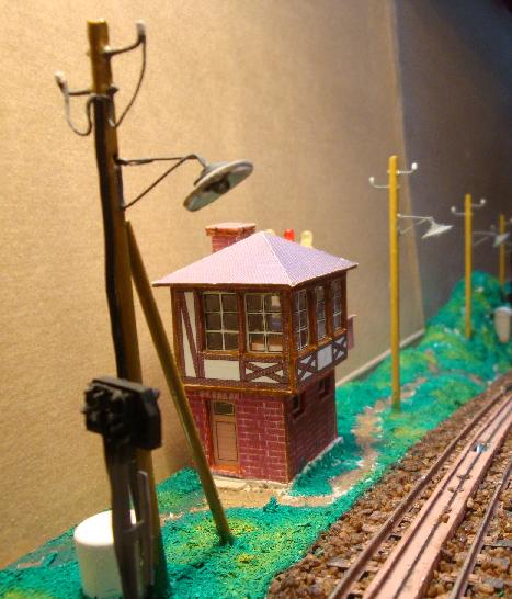 Das ist eine veränderte Variante der Lampen, hier wurden noch Isolatoren für die Zuführung der Spannung über eine Freileitung angebracht. Weitere Varianten sind natürlich möglich, z.B. rechts im Bild als Strebenmast mit Kabelzuführung. Die Freileitung wurde nicht verlegt, ist sicher ein Hindernis.