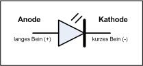 Ende vom Rohr, der Draht geht nachher leichter rein). Nun werden die Anschlüsse der LED bearbeitet. Mit einer Flachzange werden sie wie im Bild gezeigt abgewinkelt. Entspricht die Form unseren Vorstellungen, werden die Enden so abgeschnitten, dass sie sich nicht mehr berühren. Sinnvol ist, den Minus-Anschluss (kurzes LED-Bein / Kathode) nach unten zu biegen, ist aber nicht zwingend. Es kann sogar sinnvoll sein, es genau anders herum zu realisieren, z.B. wenn zwei Lampen (Bild weiter unten) an einem Mast angebracht werden soll, diese unterschiedlich schaltbar sein sollen und die Ansteuerung mittels Transistorverstärker erfolgen soll, dann ist der gemeinsame Pol die Anode, also Plus an Mast. |