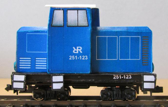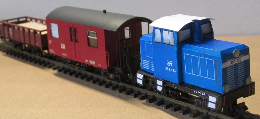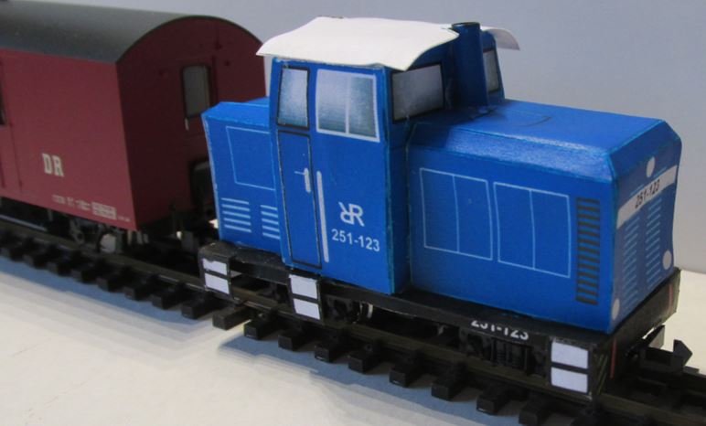 So könnte es dann aussehen! Das kann man als PDF-Datei als Ausschneidebogen herunterladen. Teil3 ist die Bodenplatte, muss auf Pappe geklebt werden. Der Ausschnitt darin passt über den Motor des Fahrgestells und rastet dort ein! Die Ausschnitte in Teilen 1 und 2 sind etwas größer, der Motor ragt hier durch. Das gilt für die Variante 1. Es wurde auf dem Ausschneidebogen für den Lok-Rahmen (Teile 1, 2, 3) zwei Variante dargestellt. Das Fahrgestell wird im ersten Fall oben, gleich unter dem blauen Aufbau arettiert, damit wird die Lok etwa 3mm flacher, was sich eventuell für die Optik der Lok positiv auswirkt (siehe Bild5). Im zweiten Fall wird der Rahmen (wie anfangs (Bild4)) komplett ausgeführt (Teile 1.2, 2.2, 3.2). Das kann man selbst entscheiden welche Variante man realisieren will. |