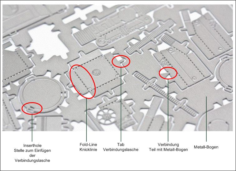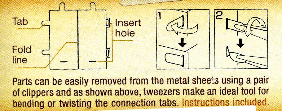 (<- Übersg: Teile können mit einer Schere (Blechschere) leicht von den Blechen entfernt werden und wie oben gezeigt, sind Pinzetten ein ideales Werkzeug zum Biegen oder Verdrehen der Verbindungslaschen. Anweisungen enthalten) |