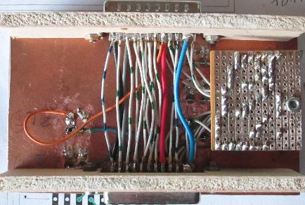 So sieht das fertig erstellte Steuermodul aus. Im rechten Bild ist die Verdrahtung sichtbar, der Bus wurde komplett durchgeführt, die Diodenmatrix wurde entsprechend der Vorlage auf eine Universalleiterplatte gelötet (rechts). Drei Leiterbahnen wurden mehr verwendet, um diese Platte auch befestigen zu können (M3 Schraube).