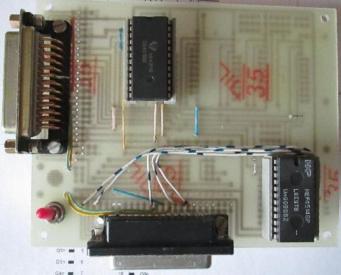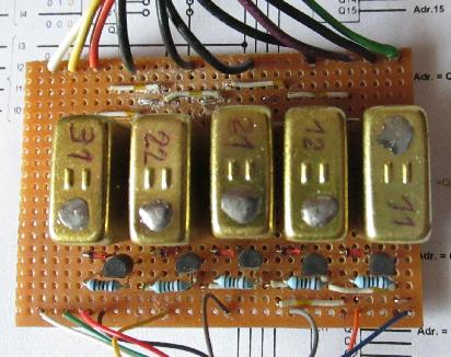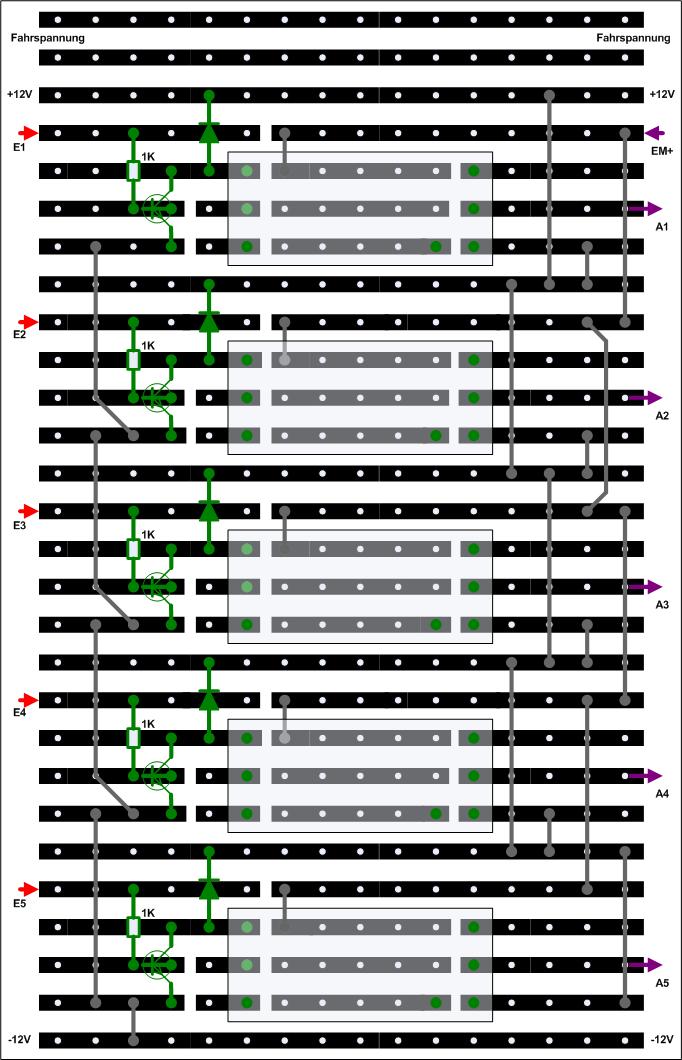 Die Schaltung besteht aus 5 einfachen Schaltungen zur Ansteuerung eines Relais. Über die SUB25-Buchse erhält man über die Leitungen 2, 4, 8, 20 und 22 die Signale (0 oder 1) der Adressen 26, 27, 28, 29 und 30. Die Relais schalten jeweils die + Spannung der Bahnplatte auf einen Taster. Die Spannung von der Bahnplatte zu benutzen ist sinnvoll, da auch eine Trennung der + Spannung vom Modulsystem und Bahnplatte möglich ist. Die Ausgänge der Schaltung (Relaiskontakte) werden zusammen mit der Versorgungsspannung und Fahrspannung wieder über ein Stecker/Buchsenpaar der Bahnplatte zur Verfügung gestellt. Die Schaltung wurde auf einer Universalleiterplatte aufgebaut: