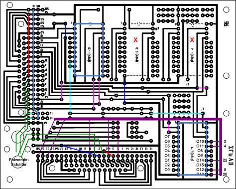 entsprechende Leitungsverbindungen. Der Mux-1 befindet sich oben links, danach Mux0 und Muxi. Der Muxj befindet sich unten rechts. Weiterhin gibt es Platz für 2 SUB25-Buchsen, 2 Schalter und ein Steckelement. Platz i ist außerdem für eventuell notwendige weitere Schaltungen vorgesehen. Die SUB25-Buchse oben links ist der Systembus, die Lötösen danach dienen dem Einlöten des System-Kabels mit Stecker zur Weiterführung des Busses. Die untere SUB25-Buchse dient der Weiterführung der ermittelten Signale und Spannungen auf die Modulsteuerung (Modul-Buchse). Die hellblauen Leitungen sind die Verbindung der Mux-1(Q1) zur Mux1(En). Die dunkellila Leitungen führen von den Ausgängen der Mux1 zur Modul-Buchse. Zu beachten ist, dass die Ausgänge des Mux sehr wild durcheinander angeordnet sind, bei Muxj gibt es Bezeichnungen! Die Leiterplatte wird von der Bauelementeseite dargestellt.
