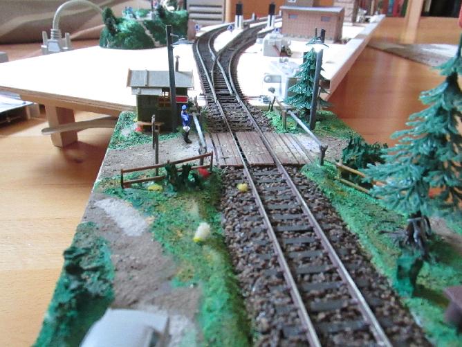 Viertelmodul Bahnübergang. Mechanisch und elektrisch funktioniert es! Aus der Perspektive sieht man nun auch, da der Übergang der Bahnhofsplatte zum Modulsystem auf die Ecke gelegt wurde, passt jedes Modul (aus dem Modulsystem) an die Bahnhofsplatte bzw. die Bahnhofsplatte kann an jedes Modul angekoppelt werden! Ein Problem zeigte sich mit den zu T-Flip-Flop umfunktionierten 4027, die Variante ist unzuverlässig, hier wird es eine andere Lösung geben.