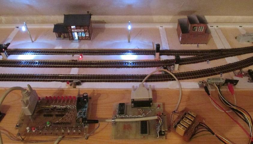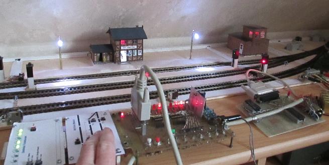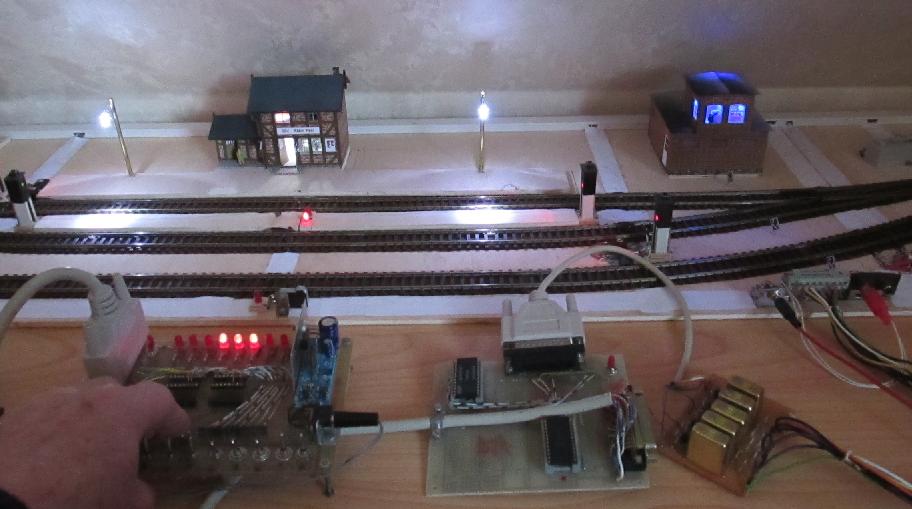 Wie bereits angedeutet, ist das recht einfach zu realisieren, indem einfach zu den Tastern auf der Bahnhofsplatte vom System gesteuerte Relais-Kontakte parallel geschaltet werden.