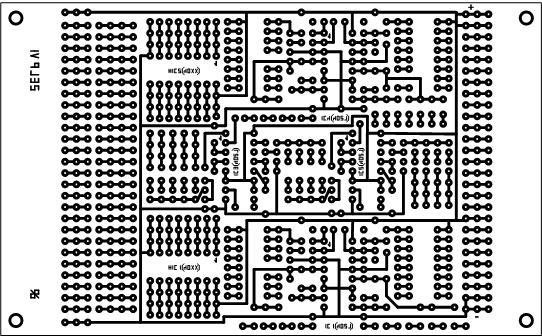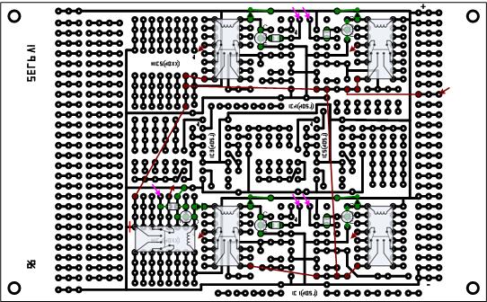 Als Relais wurden alte GBR's verwendet, auch die Transistoren und Dioden sind alt. Mit "finder"-Relais gibt es auch eine Leiterplatte (es sind nur 2 Relaissteuerungen komplett dargestellt). Die Leiterplatten werden von der Bauelementeseite dargestellt. Es gibt auch eine standardisierte Universalleiterplatte für den Aufbau der Schaltelemente, das sieht bestückt so aus, die Platte ist aber wenig ausgenutzt, so dass eine Universalleiterplatte dann doch ausreichend ist!. |