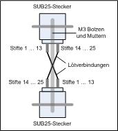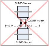 Die bessere Variante ist, man verdreht die Stecker zueinander. Nun steht zwar die Stiftreihe 1 bis 13 der Reihe 14 bis 25 gegenüber, aber die Reihenfolge stimmt wieder. Man muss nun nur die Drähte kreuzen, das lötet sich aber auch nicht gut. |