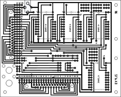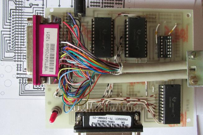 Links das Bild der realen Leiterplatte. Oben links ist entsprechend die Buchse zur Extraversorgung mit 12V Betriebsspannung zu sehen. Rechts oben ist der 14-polige Sockel für das Transmissions-Gate eingelötet, aber noch kein Bauelement eingesteckt. Erste Versuche zeigen, dass eventuell auf dieses Bauelement verzichtet werden kann, wahrscheinlich geschuldet der Tatsache, dass alle Pull-Down-Widerstände einen Wert von 100KΩ haben. Die Platte kann mit zwei Systembuskabeln angeschlossen werden, das eine hat einen SUB25-Stecker, das andere, ein kürzeres, hat eine SUB25-Buchse. |