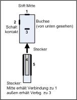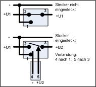 symbolische Darstellung. Im linken Bild erfolgt die Beschriftung und die Darstellung von Buchse und Stecker (Buchse von unten gesehen). Im rechten Bild wird die Funktion dargestellt. Beim Einstecken des Steckers erfolgt eine Verbindung des Stiftes der Buchse (1) mit dem Innen des Steckers (4). Die Verbindung (2) nach (3) in der Buchse wird unterbrochen und außen des Steckers (5) mit Anschluß (3) der Buchse verbunden. Will man also + schalten, so muss + auf (2) gelegt werden und auf den Stecker außen (5) das "neue" +. |