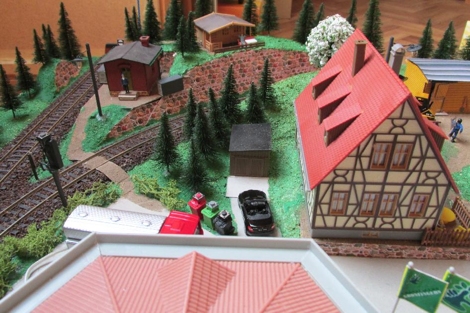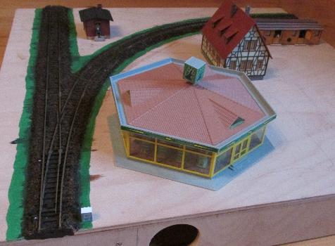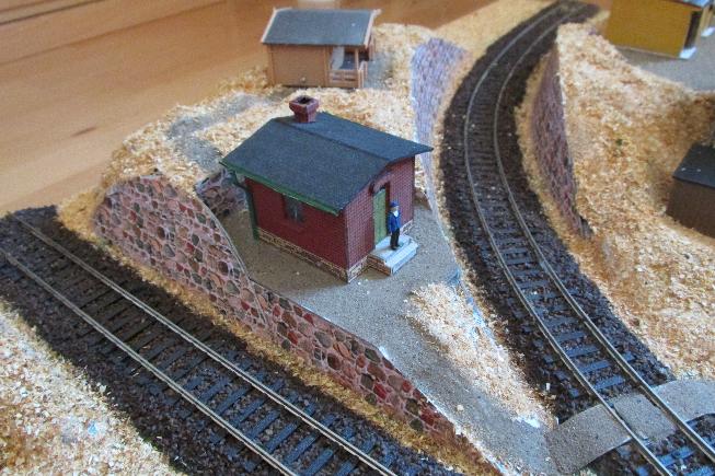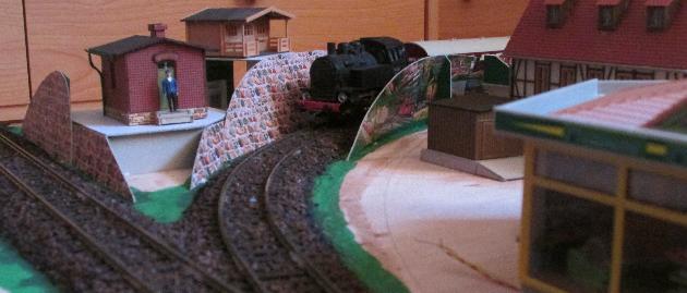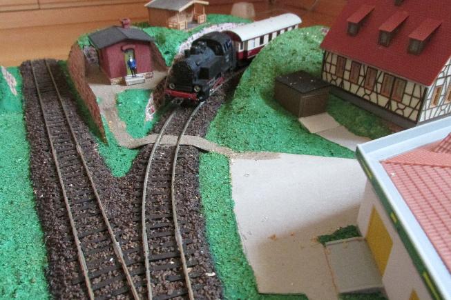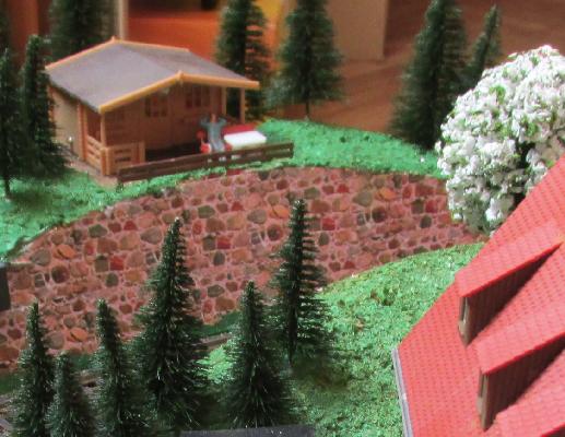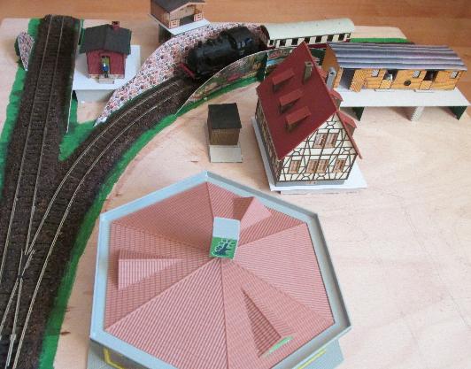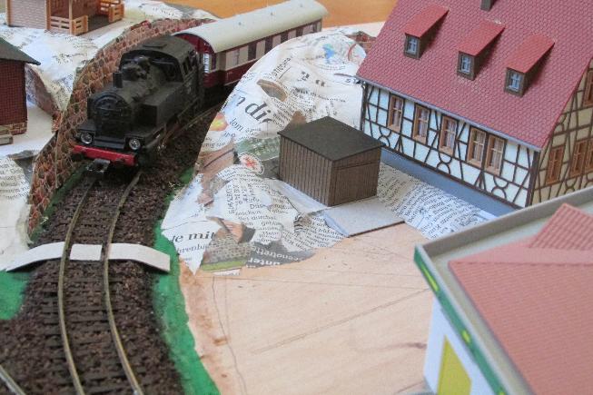 wieder eine Knüllpapiervariante den Berg gestalten. Auch der Bahnwärter hat nun einen höheren Standort und ganz oben hat er seine Wochenendhütte zum Entspannen. Und so verändert sich das Gelände täglich |