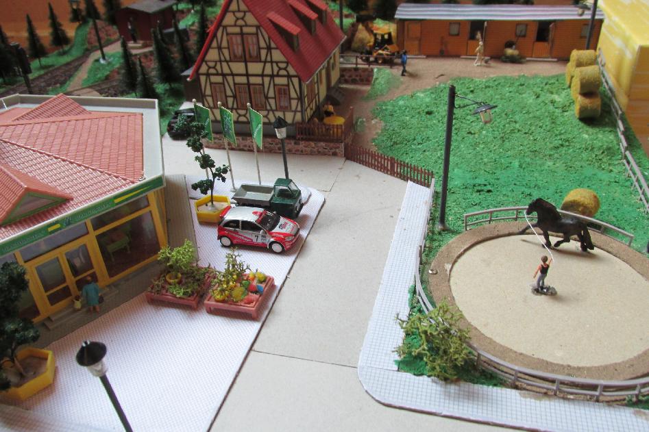 auf dem Bild gibt ein Pferd, es sollen sicher aber mehrere sein, einen Parkur, Blumen und Bäume. Was kann man daraus machen? Zunächst soll ja die Eisenbahn eine Abzweigung auf diesem Modul haben (ist die mündliche Aussage), also braucht man auch ein kleines Bahnwärterhaus. Der Reiterhof braucht sicher einen Pferdestall und ein Wohnhaus für den Chef. Die Blumen können natürlich überall wachsen, aber in einem Blumenladen könnten auch welche verkauft werden - das ist das Konzept! |