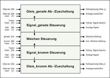 abschaltbare Gleisabschnitte gibt, der gerade und der krumme Gleisabschnitt. Das ist sinnvoll, da beim Betrieb schon mal auf einem Gleisabschnitt der eine Zug auf den anderen warten muss. Jeder Gleisabschnitt ist dann noch einmal unterteilt, ein vom Signal beeinflußter Abschnitt (Sk und Sg) und der Rest (Gk und Gg). Die Signale stehen jeweils am Ende der abschaltbaren Gleisabschnitte in Richtung Weiche. Die Fahrspannung am Signal wird über den jeweiligen Gleisabschnitt bereitgestellt. Das ist notwendig, da in Gegenfahrtrichtung bei Halt die Durchfahrt möglich sein soll, dann würde der am Signal im Halt stehende Zug auch rückwärts losfahren. Die einzelnen Abschnitte und die Weiche sollen übers Bussystem angesteuert werden Als weitere Leistung soll wie beim " Kindgerechten Bahnhof " mittels Schalter am Signal der Zug in Fahrt gesetzt werden können. Dazu soll die Weiche entsprechend gesteuert, der Gleisabschnitt für eine gewisse Zeit mit Fahrspannung versorgt werden und das Signal "Fahrt" zeigen. |