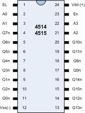 Die Anschlussbelegung des 4514/15 muss genau beachtet werden. A0 bis A3 sind die 4 Busleitungen, wobei A0 20 und A3 23 entspricht. Die Eingänge müssen immer beschaltet sein. Besonders aufpassen muss man bei den Ausgangsleitungen, die haben eine sehr wirre Anordnung. EL wird auf 1 (+) gelegt, En ist die negierte Enable-Leitung, liegt hier also 0 an, ist der Demultiplexer aktiv. |