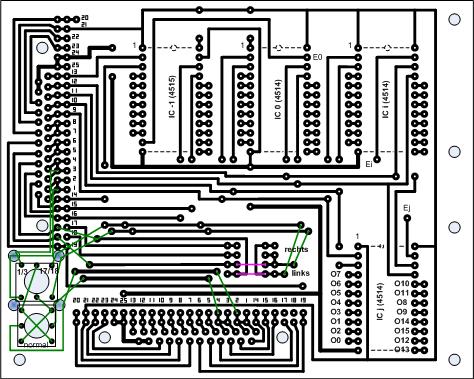 IC j = De-Multiplexer (j); die grauen Kreise sind Löcher zum Befestigen der Buchsen,