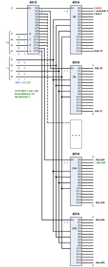 Der De-Multiplexer (0) ist fest mit dem Ausgang 0 des De-Multiplexers 4515 (obere 4 Bits der Adresse) verbunden, d.h. er gibt den De-Multiplexer (0) nur frei, wenn dieser Teil der Adresse Null (0000) ist. Der untere Teil hat z.B. den Wert 1 (0001), dann wird genau der Ausgang1 des De-Multiplexers (0) aktiv. Liegt eine andere Adresse am Eingang, z.B. 163 (10100011) dann wird Ausgang 10 (1010) (vom 4515) aktiv. Dieser Ausgang muss an den Eingang En eines weiteren De-Multiplexers gelegt werden, in diesem Fall der untere (k), dieser ist nun aktiv. Der untere Teil der Adresse ist 3 (0011) und aktiviert nun den Ausgang 3 auf diesem De-Multiplexer. Ein weiteres Beispiel zeigt die Adresse 73 (01001001), die auf den De-Multiplexer (i) gelegt wird, die Adressen müssen also nicht benachbart sein.
