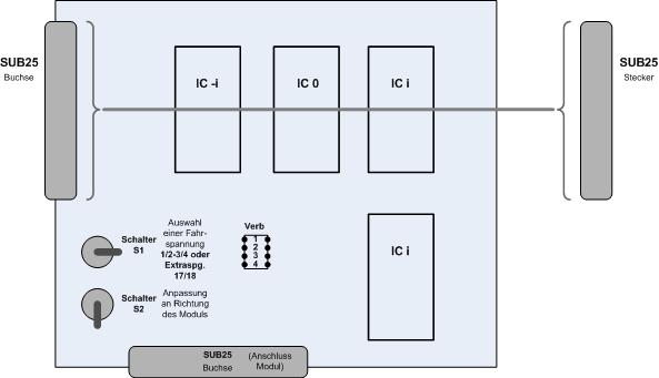 Die Ausgänge auf dem Modul werden wieder einer D-SUB25-Buchse zugeführt. Der Grund dafür ist, dass leicht alles auseinandernehmbar sein soll. Durch wahlweises Stecken der Verbindungen Verb1 - 4 kann variabel zu angrenzenden Modulen eine Verbindung hergestellt werden. Als Verbindungssystem werden 8-polige IC-Sockel und entsprechende Drahtbrücken benutzt.