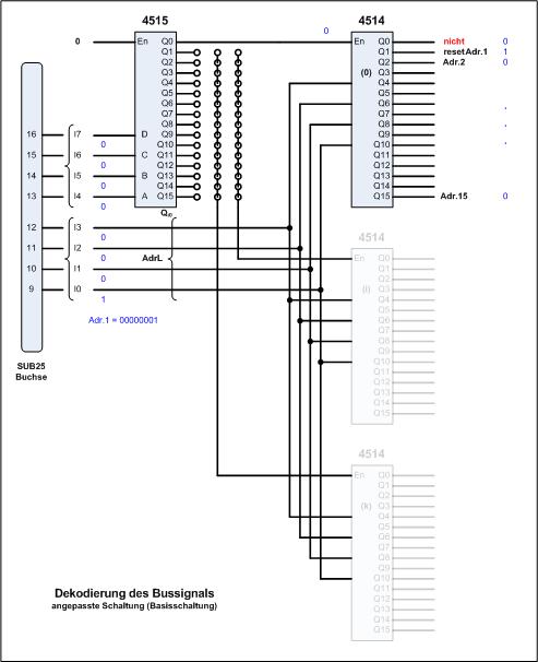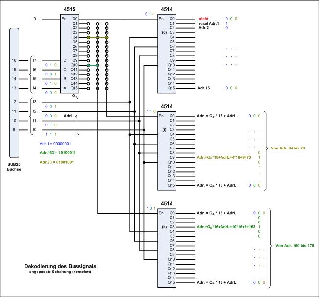 Wenn beispielsweise alle Leitungen verlegt werden, aber die De-Multiplexer (i) und (k) nicht eingebaut werden, dann funktioniert die Schaltung dennoch für die Basisadressen 1 bis 15. Die Auswahl eines weiteren De-Multiplexers, der dann aufgebaut werden muss, erfolgt durch eine Drahtbrücke vom Ausgang des De-Multiplexers 4515.
