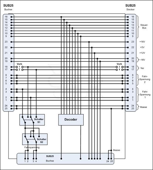 Die D-SUB25-Buchse links wird auf die Platte aufgelötet. Dahinter wird sofort das Kabel mit dem D-SUB25-Stecker angelötet. Von hier werden die Leitungen des Busses in beschriebener Weise auf die De-Multiplexer-Schaltkreise verteilt, die Fahrspannung auf die Schalter und die weiteren notwendigen Leitungen ebenfalls auf die Modulanschluss-Buchse. Nun reichen die 25 Leitungen dieser Buchse, die müssen nicht genormt sein aber doch weitgehend gleich, Fahrspannung ist auch hier Leitung 1 / 2 und 3 / 4 usw..