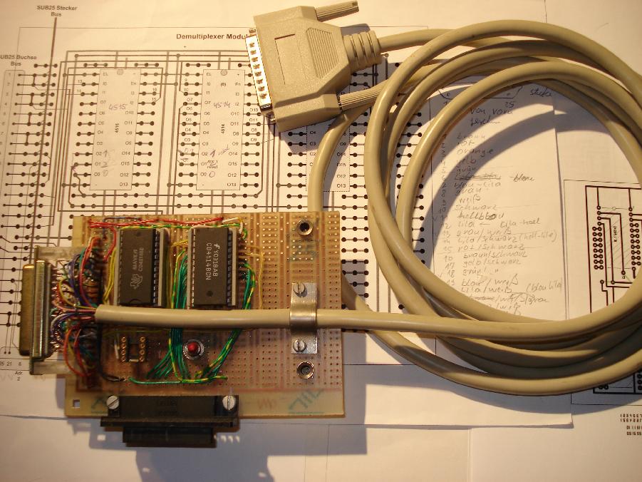 Die Platte hier könnte maximal 3 De-Multiplexer aufnehmen (3. anstelle der Schelle). Neben den vielen Drahtbrücken sind die D-SUB25 Buchsen ein Problem für die Universalleiterplatten, denn diese haben ein Rastermaß von 2,5mm. D-SUB25 hat ein Rastermaß von etwa 3mm und außerdem in 2 Reihen versetzt, das passt überhaupt nicht.