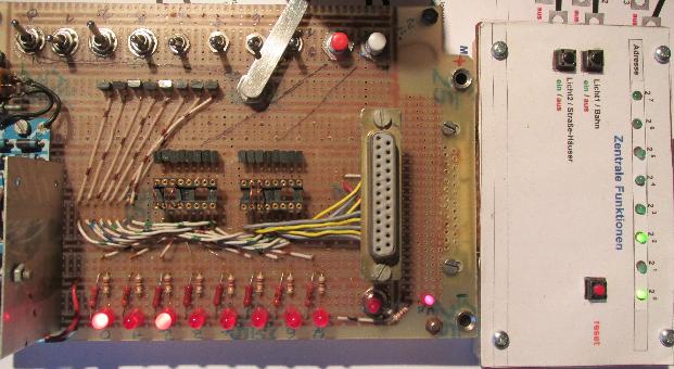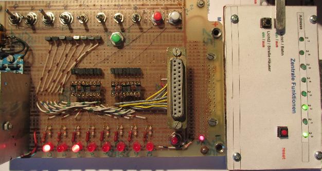 Bei genauem Hinschauen konnte man feststellen, dass bei der Nutzung der Testschaltung diese Probleme nicht auftraten, hingegen bei der Nutzung des allgemeinen Steuermoduls, auch wenn beide Teile direkt hintereinander steckten, der Fehler auch auf dem neuen Modul auftrat. Das deutet auf einen Fehler in dem zentralen Steuerteil hin. Die Adressanzeige-Dioden zeigten beide die richtige Adresse!