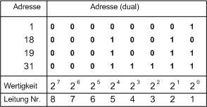 Hat die Schaltstelle z.B. die Adresse 19, so wird daraus dual 00010011. Das genau