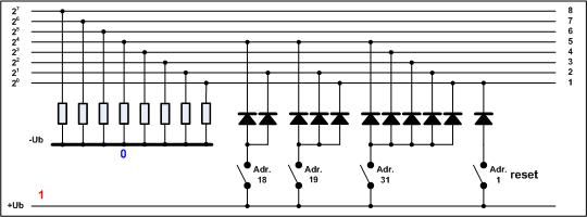 Das Ganze funktioniert sehr gut, denn wird z.B. die "Reset-Taste" betätigt, wird eine 1 auf die Leitung 1 gelegt. Die Dioden auf die Leitung 1 der Adressen 19 und 31 sind für diesen Fall in Sperrrichtung geschaltet. Das ist sehr gut, denn anderenfalls würde nun diese 1 sonst auch auf den Leitungen 2, 3, 4 und 5 geschaltet werden, das wird verhindert.