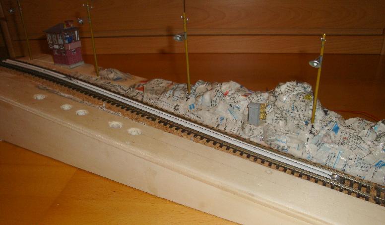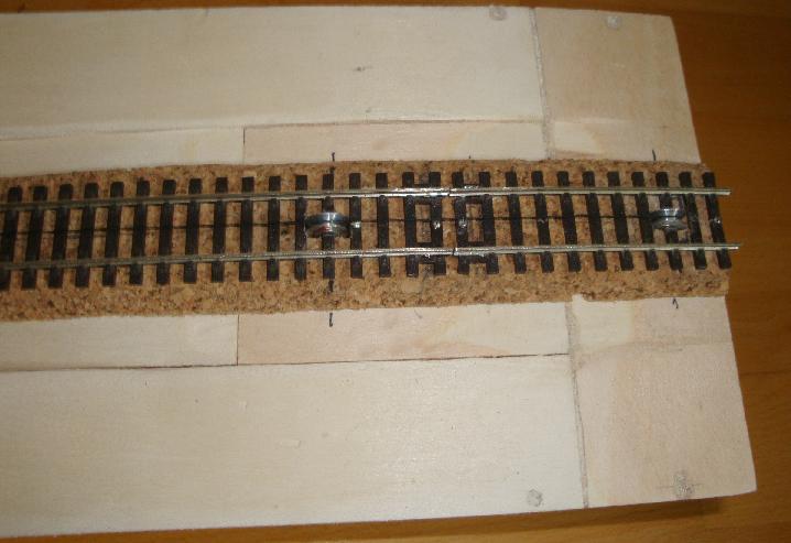 Gleises mittels Zwischenklötzchen und dem Trassenbrett für die Abfahrt erstellt.