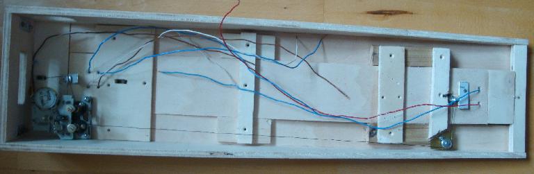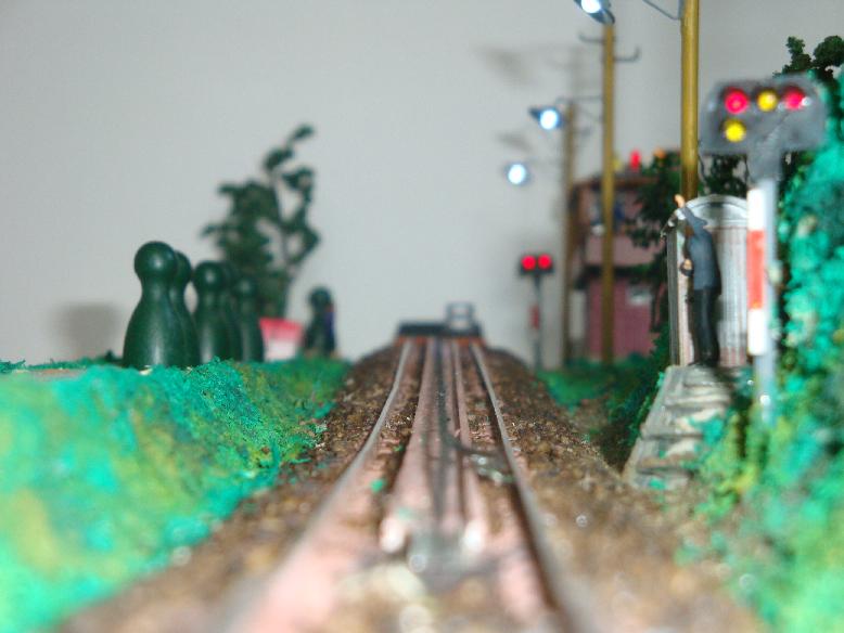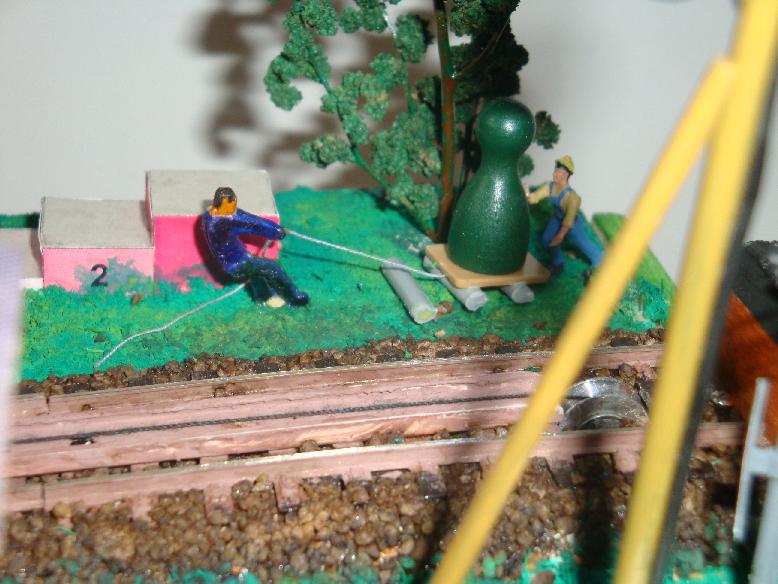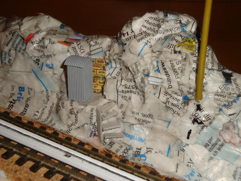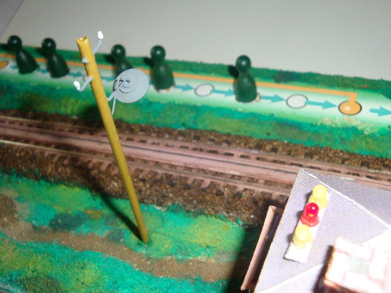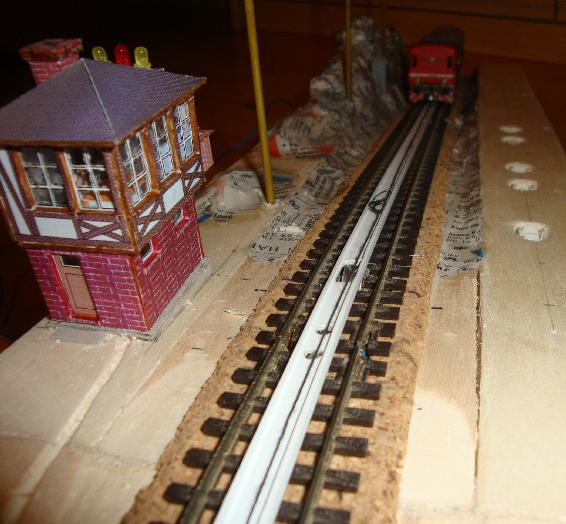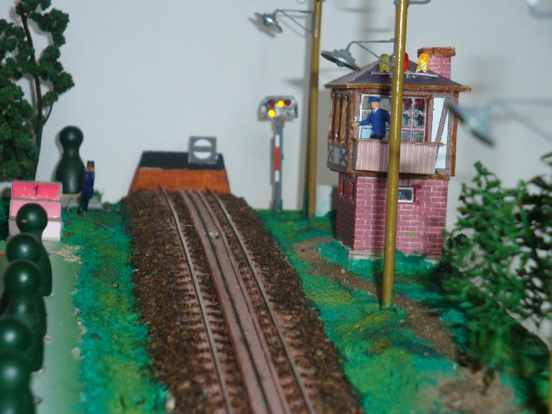 ![]() Von einer kleinen Hütte meldet der Arbeiter vollzug über die Kopplung des Zuges mit dem Seil. In den Löchern auf der gegenüberliegenden Seite befinden sich die Schalter zur Bedienung des Fahrbetriebes (siehe unten). Die Lichtsperrsignale (Lsp) zeigen z.Z. das Rangierfahrtsignal (Ra 12). Sie werden durch die Elektronik mit Auswahl des Betriebszustandes gesteuert (siehe Elektronik). Die Signale entstanden aus einem Bausatz, der jedoch anstelle der weißen Lichter nur gelbe anbietet. |