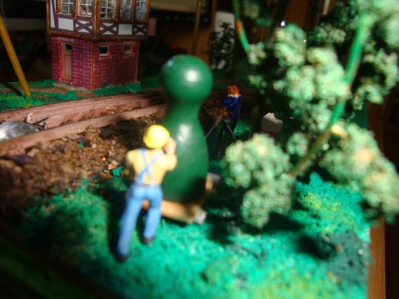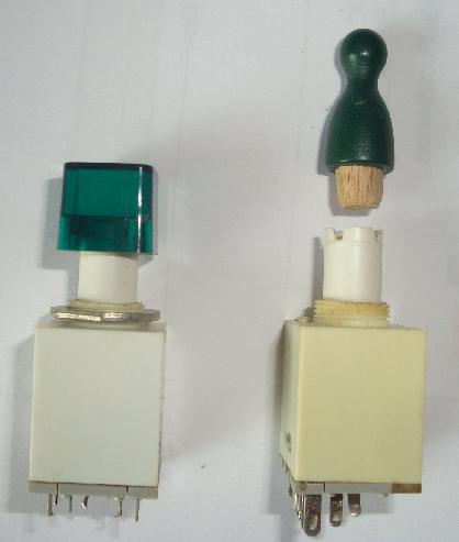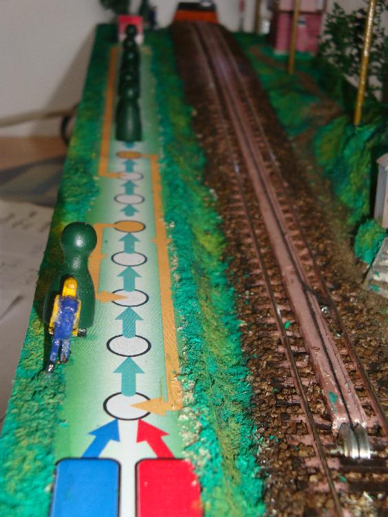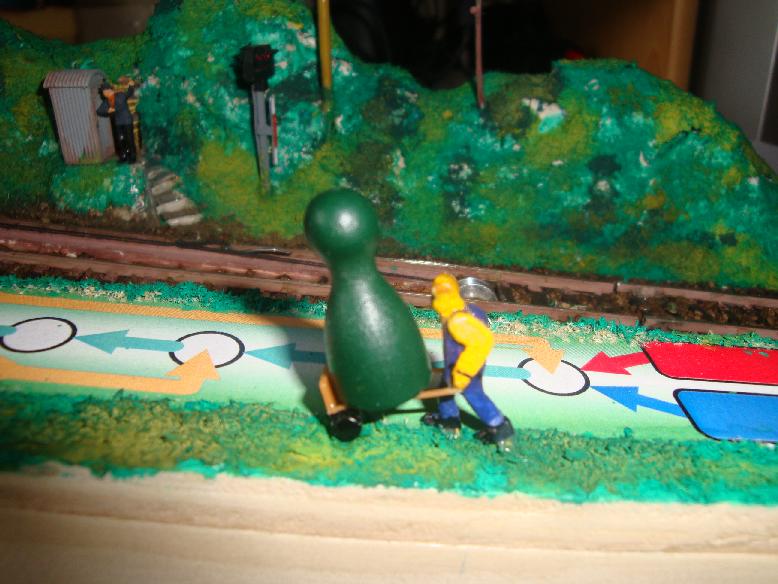 den "Berg" hinauf zu befördern. Dazu wurde die alte Kappe entfernt, die Spielfigur erhielt ein Stück Dübel (etwa 6mm Durchm. angeleimt) und schon steckt die Figur recht sicher im Schalter. Und was ist das Ganze? - ein Spiel |