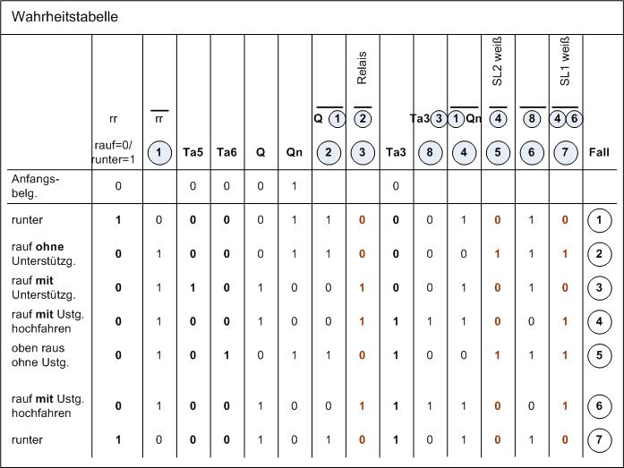 Um zu kontrollieren ob die Logik richtig funktioniert kann man eine Wahrheitstabelle anlegen. Dazu wurden in der Schaltung weitere Meßpunkte (Zahl im grauen Kreis) festgelegt. Die Tabelle sieht nun so aus: