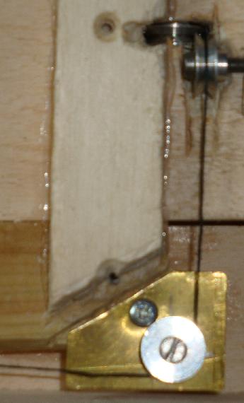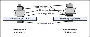 Eine kleine Bemerkung zu den Umlenkrollen Links im Bild sind zwei Varianten zur Befestigung der Rollen dargestellt. Die Variante a (links) wurde als erstes aufgebaut: Loch in die Grundplatte (etwa 3mm); Schraube durch; Unterlegscheibe; Rolle; 2 Muttern zum kontern. Das rollt zunächst gut - aber nicht mehr wenn ein Seil um die Rolle läuft! Dann neigt sich die Schraube zur Seite, von wo der Zug kommt und klemmt damit die Rolle fest, dann sind die Rollen sinnlos geworden, das ganze geht nun sehr schwer. Nur die Variante b (rechts) geht. Hier wird erst einmal die Schraube durch eine Mutter festgestellt, nun gibt es kein Verklemmen mehr! |