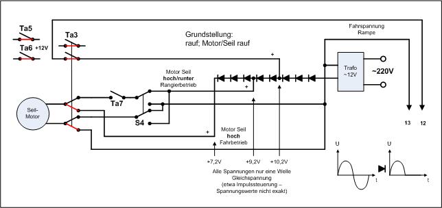Gesteuert wird die Logik über die Taster Ta5, Ta6, Ta3 und der Fahrspannung (letzteres